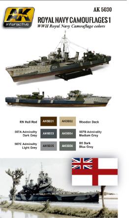 In this first set are included the typical colors most used by the different manufacturers in the different schemes, with which we can make multiple combinations. Specially those used in medium and large size ships like Cruises, Battleships or Aircraft carriers. The set contains six acrylic paints specifically designed to paint Royal Navy camouflages during WWII. The colors within each bottle are true to the satin original color; to ensure historical accuracy of your finished model AK paints have been designed taking into account the Scale Reduction Effect*.