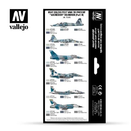 Set with 8 Model Air colors, developed to paint the predominately blue camouflage patterns of the “Aggressor” Squadrons of the USAF. The set includes six profiles, including those most recently deployed during the” Red Flag” maneuvers of 2017 and 2018. The colors have been developed on the basis of intensive research and investigation based on the analysis of available data and the set includes a detailed description of the camouflage schemes and the colors needed for their reproduction. With the collaboration of “Pieza a Pieza Modelling Workshop”.