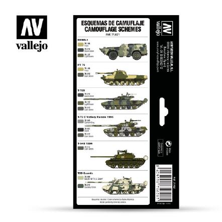 This set contains a selection of colors for painting the camouflage patterns on contemporary soviet combat vehicles, using as reference the official colors of the URSS. The set includes also camouflage patterns used nowadays on AFV vehicles.
