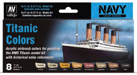 The set is suitable for painting the scale model of the Titanic, offering the most suitable and correct shades based on the latest research and historical sources. For example, the draught color below hull, which has often been represented in a dark red tone and, according to historical samples and records of the time, it was indeed a dark salmon hue similar to that used on the Queen Mary and other Olympic-class ships.