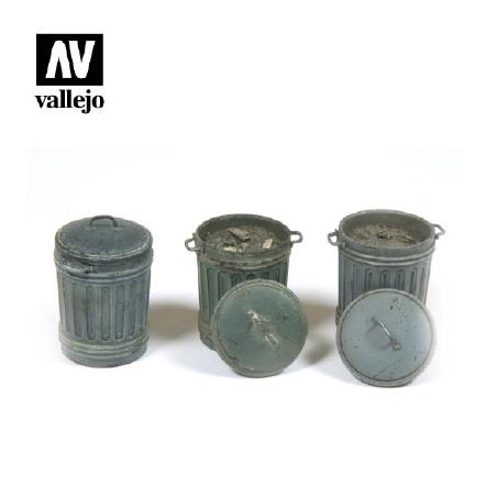 Three metal garbage bins of contemporary design, including separately the covers for the bins.