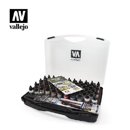 De Model Air box bevat 68 kleuren, Glossy Varnish, Matt Varnish, Satin Varnish, Airbrush Thinner, 3 penselen en een kleurenfolder